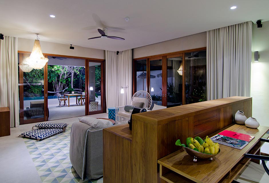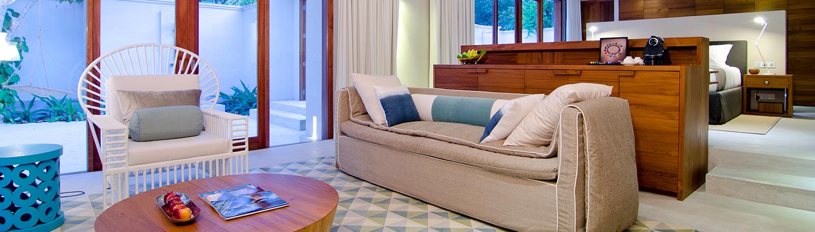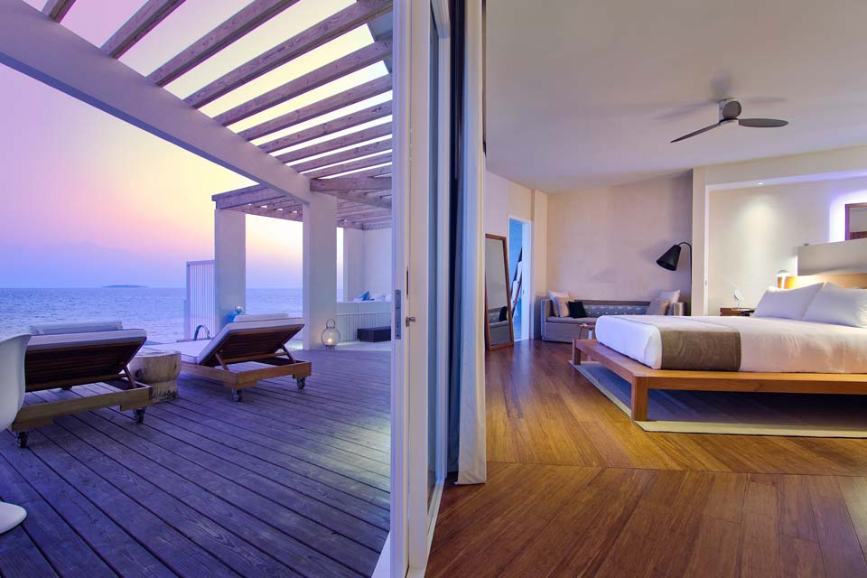 夢想的建筑,將馬爾代夫的陽光、碧海和藍(lán)天完美融合成永恒迷人的風(fēng)景線。每間臥室望出去都是醉人的馬爾代夫景色。內(nèi)飾為褐色和奶油色的黃褐色色調(diào),配以定制的木門和木窗,布置風(fēng)格簡潔而整齊。其設(shè)計直接、線條時髦且極富現(xiàn)代感,以炫酷的木質(zhì)甲板為基礎(chǔ),與精心修飾的熱帶風(fēng)格形成完美搭配。