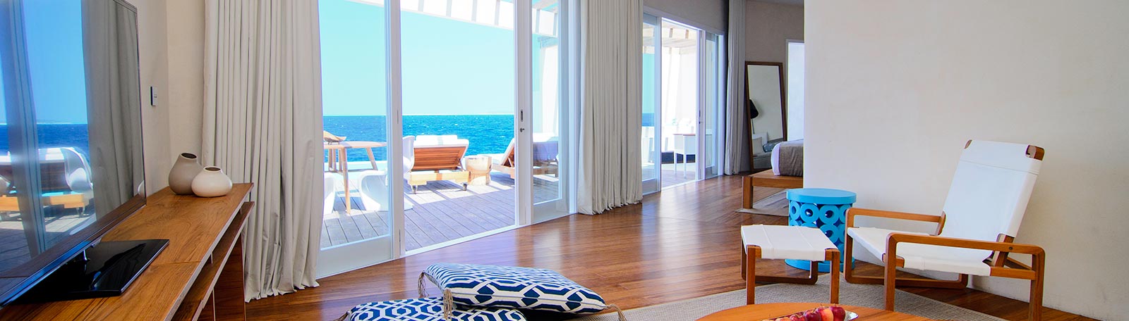 當(dāng)您在我們的海洋水上屋內(nèi)午休時,從您自己的室外露臺或淡水泳池都可以欣賞到令人著迷的海景和青綠色的環(huán)礁湖。那里是日光浴、休閑和用餐的完美之地?,F(xiàn)代、時髦的房屋海洋水上屋內(nèi)設(shè)空調(diào)且能夠直接通達(dá)大海。