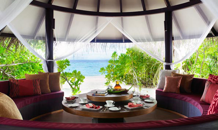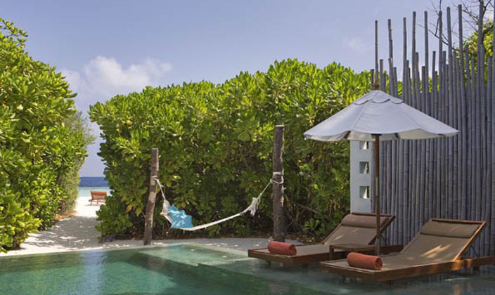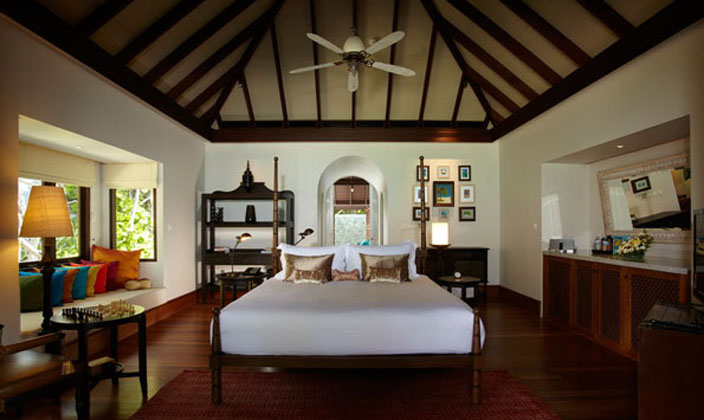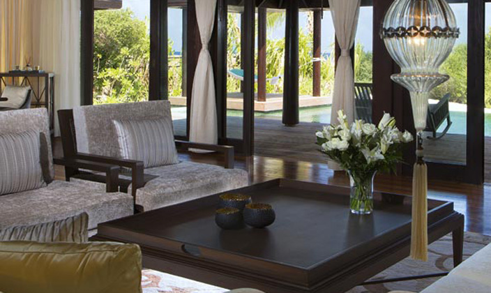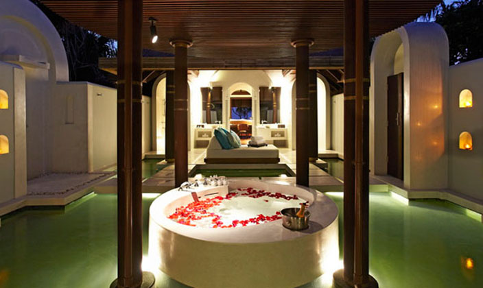 兩個主臥室別墅與中央別墅分隔而立,都擁有半露天浴室,沉入式浴缸周圍環(huán)繞著水塘、瀑布和戶外雨林式花灑。 第二棟宅邸擁有第三個主臥室,配有私家泳池和用餐亭、同樣寬敞的浴室和一個私家入口。每棟宅邸的客人共享大片的熱帶花園,以及按摩亭和設(shè)有水煙休息區(qū)的海灘小屋,更有私人管家24小時貼心服務。