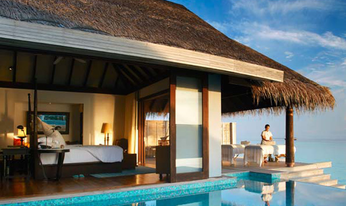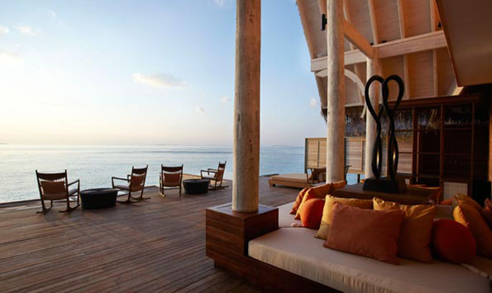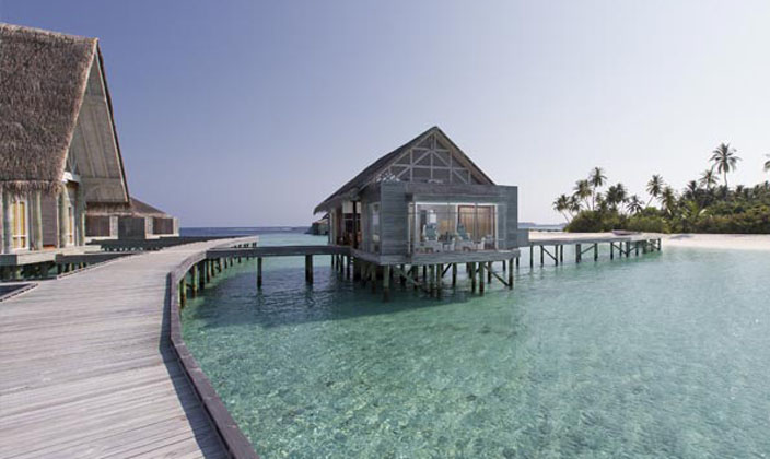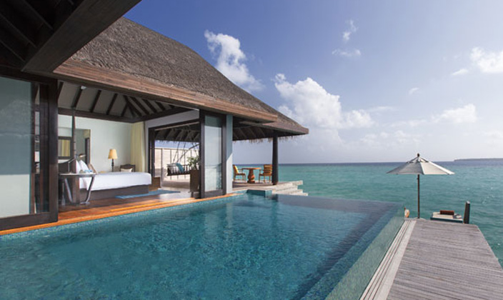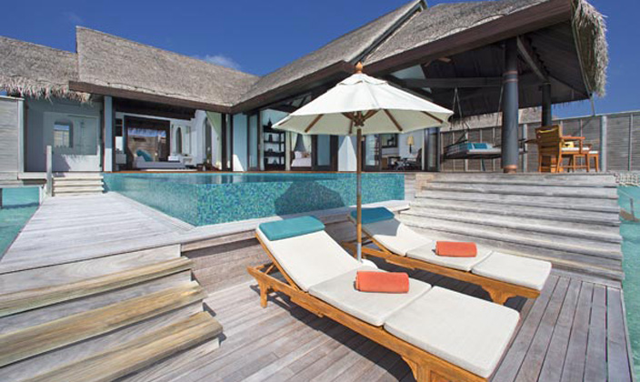 水上別墅能帶您他體驗水生活的魅力,用條紋木材搭成而建在水上,并配有挑高的天花板和硬木地板的水上泳池別墅讓您感覺仿佛置身于大海之中。從你的私人游泳池欣賞令人眼花繚亂不斷變化的天空和馬爾代夫夕陽戲劇。浴室設(shè)有凹陷的玻璃底浴缸吸收下面波光粼粼的海景,甲板還有一個超大的的無邊泳池。