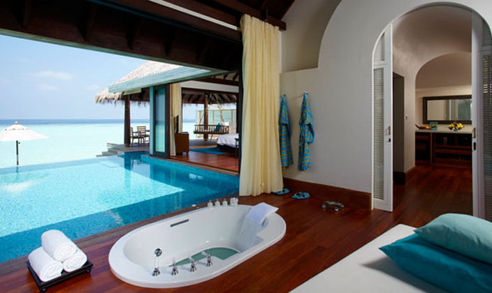 水上泳池別墅建在水上。 房間寬敞明亮,灑滿了五顏六色的鮮花,散發(fā)著陣陣的熱帶清香。 蓋著埃及棉布,枕著個性化的枕頭,酣然入夢。由條紋木材搭成,配有挑高的天花板和硬木地板。 這些超大別墅配有男女獨立步入式衣柜、冰酒器、私人泳池和陽光甲板,可以俯瞰一望無際的大海,營造一種無與倫比的水上豪華體驗。 259平方米的寬敞空間,讓您感覺仿佛與大海連成一體。