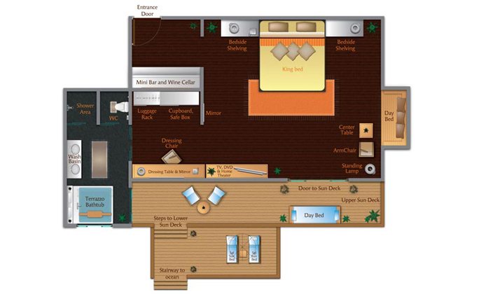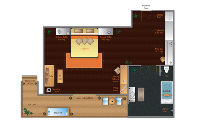 熱帶木建造的奢華別墅,四周環(huán)繞著蔚藍(lán)水域和白色沙粒,別墅享有充足的陽光,配有一張坐臥兩用長(zhǎng)沙發(fā)以及帶浴缸的大浴室、平面電視、DVD播放機(jī)和咖啡機(jī)。