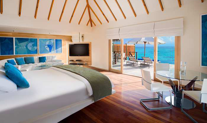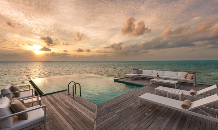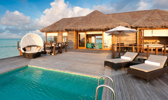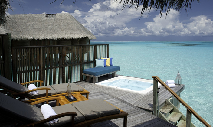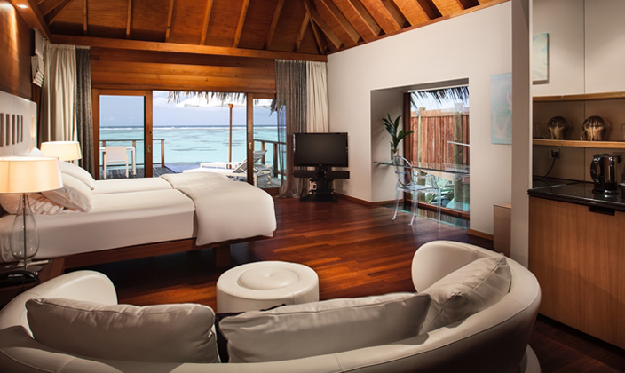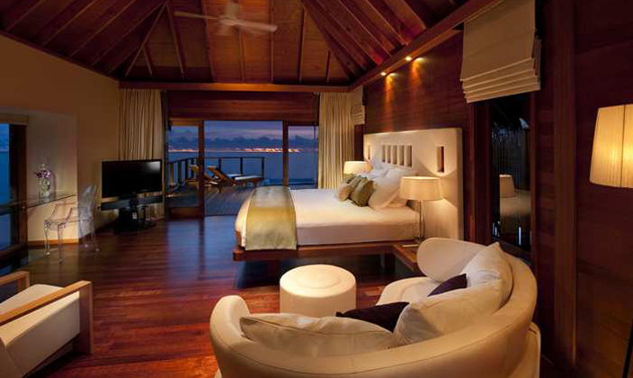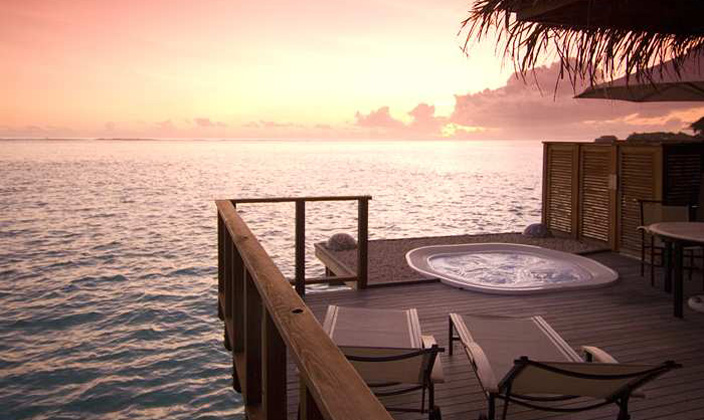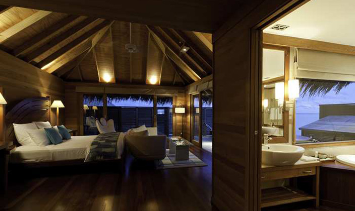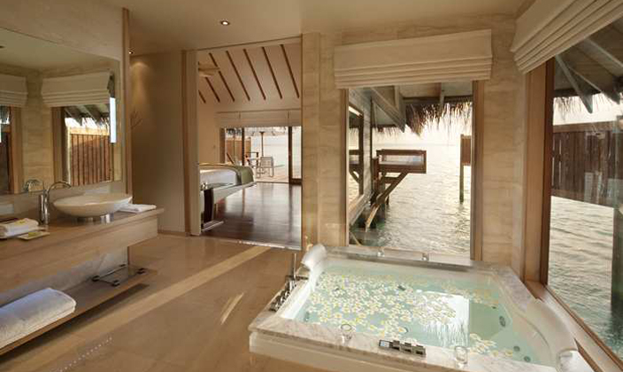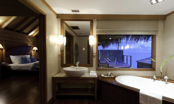 提供日光浴與無限池,沉沒浴缸,浮床。這個別墅是建立在高蹺上的水和室外陽臺與大無邊泳池。日光浴甲板上還具有木制太陽傘和躺椅,咖啡桌。甲板上有一個凹陷的泳池,和一個50寸的等離子電視??照{(diào)別墅還帶有一個冷藏迷你酒吧,iPod連接器和一系列的沐浴產(chǎn)品CD音響。