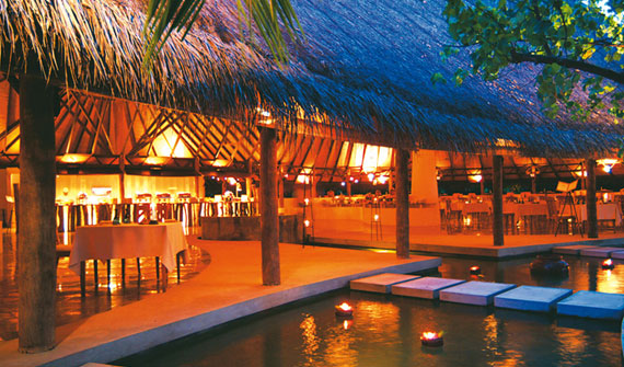 餐廳設(shè)置在庭院中,是一個(gè)巨大的大餐廳,周圍圍繞著水池,燈光昏黃優(yōu)美。供應(yīng)馬爾代夫、泰國(guó)及其他亞洲地區(qū)的美味佳肴。