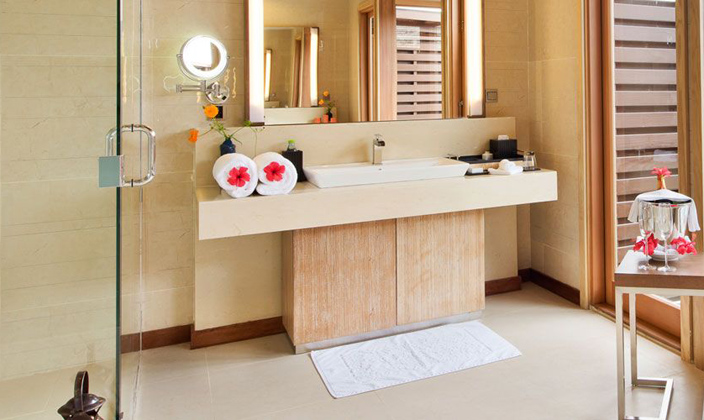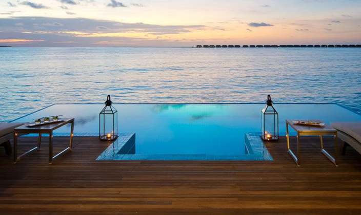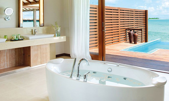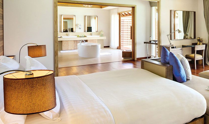 該套間立于清透的湖水中的木制腳柱上,雙臥房,雙衛(wèi)生間,這一切使海景套間成為蜜月度假的首選。起居室和餐室舒適典雅,別墅用餐區(qū)的日光臺(tái)上可以欣賞無(wú)盡