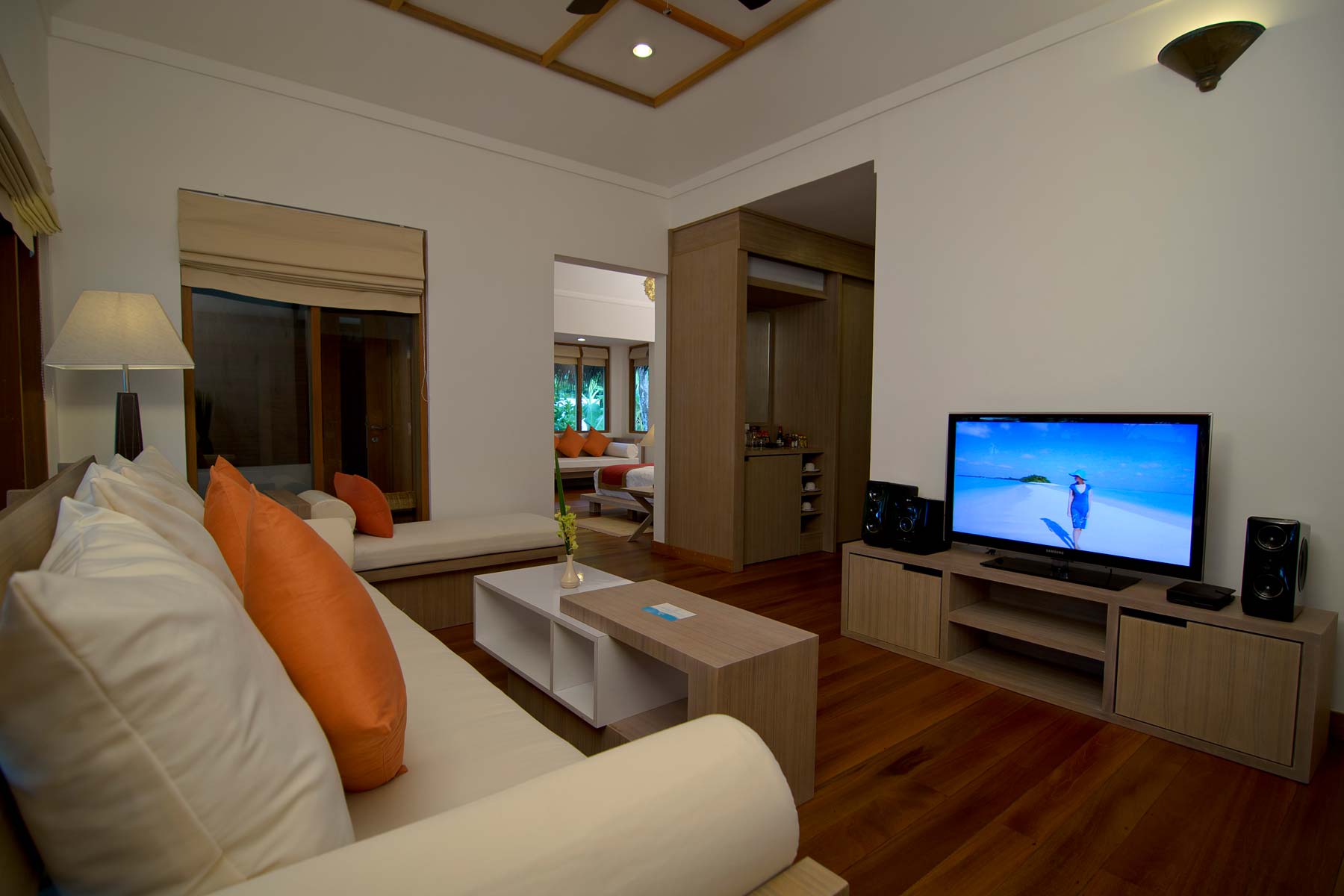 豪華水上別墅的特征一個特大號床和沙發(fā)床,寬敞的浴室提供獨立的浴室。享受悠閑的海上日光。