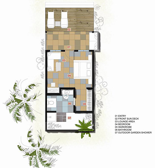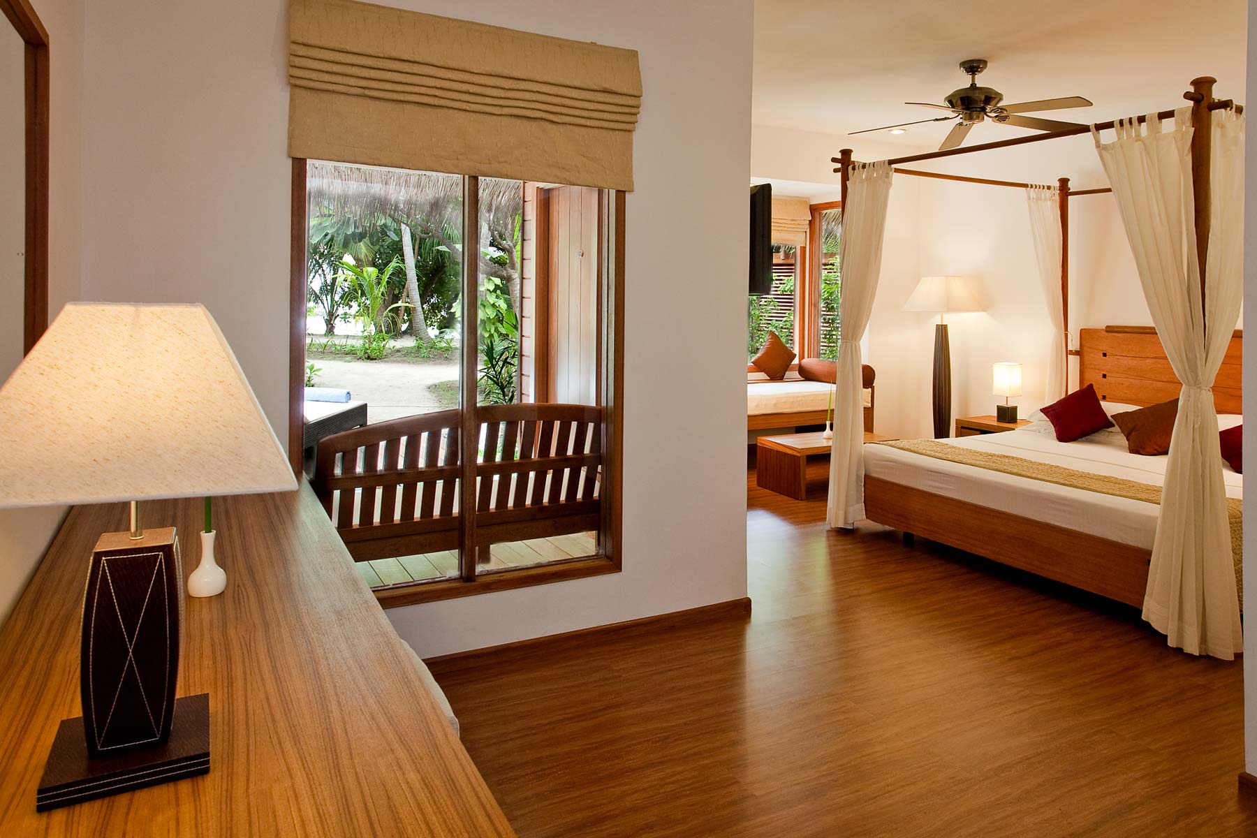 海灘別墅是隱藏在茂盛的植物中的獨立別墅,距離海灘只有幾步之遙。這些別墅面對島上的瀉湖側(cè),設(shè)有特大四柱床,寬敞的木質(zhì)甲板的前部有沙發(fā)床和躺椅。海灘別墅還包括半露天的浴室,設(shè)有戶外花灑淋浴。