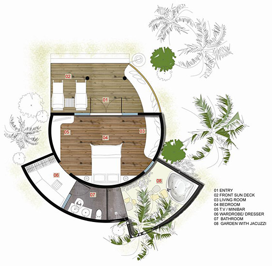 這些別墅屬當(dāng)代設(shè)計。別墅呈圓形,包括一個木甲板,一個誘人的內(nèi)置在室外的長椅和日光浴椅。臥室是寬敞,簡約的,還有特大號床。別墅還有露天浴室,戶外按摩浴缸。