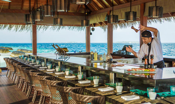 美食特色:葡萄酒、雞尾酒。餐廳介紹:Kandu海濱酒吧設有寬闊的水上露臺,沙發(fā)床、分離臺、休閑廳等,在您品味上等的葡萄酒時可以觀賞在您腳下穿梭往來的各種海洋生物。晚上有現(xiàn)場樂隊的表演??旎畹腄J臺和創(chuàng)意雞尾酒,令人振奮的馬爾代夫舞蹈,讓您的輕松的心情延續(xù)到深夜。