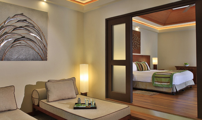 每間都有泳池,花園圍繞的高級按摩浴缸以及具有療效的按摩步道。有優(yōu)美的小瀑布、露天淋浴及有草亭遮蔭的雙人躺床,私人庭院設有唯一從海灘通往日光場浴池的入口。