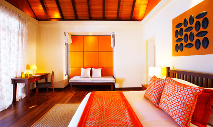兩間豪華的臥室包含兩個游泳池,設有寬敞海岸平臺可以俯瞰沙灘。由院門入口進入房間,會穿過一個裝飾優(yōu)美的水池庭院,水池兩側(cè)各設有一個茅草亭。內(nèi)院可通過休息室及客廳,還附有儲物間和客用洗手間。