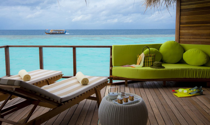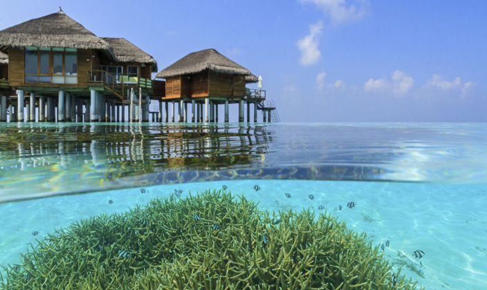 這些宏偉的別墅建在水上,每一個水上別墅完全是私人的,碼頭有私人通道可直接進入,別墅外是私人的木制甲板躺椅休息區(qū),從那里你可以看不同顏色的熱帶魚游泳,也可以直接從樓梯處下海。