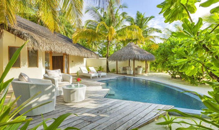 散落在高蹺藍色瀉湖上從私人木制甲板可以直接進入海水中,兩個海灘別墅之間共享私人游泳池每個泳池別墅都有一個共同的入口走廊和一...查看更多