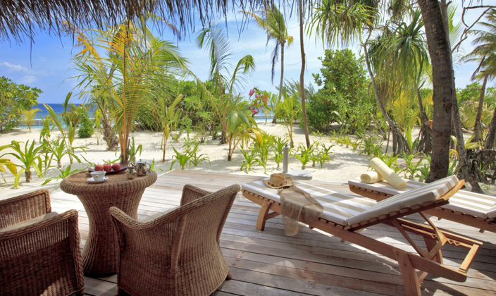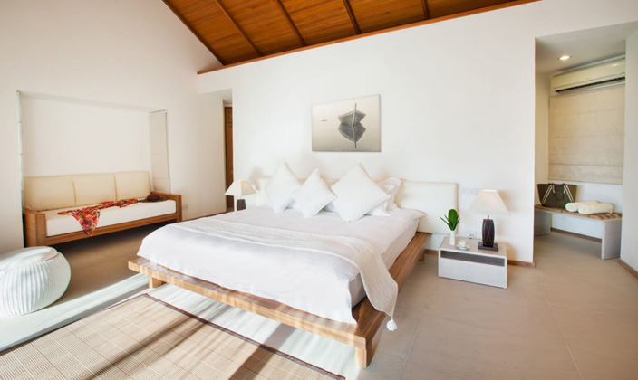 別墅坐落在海灘,有私人陽臺,房間浴室是半開放式的,并設有雙面盆和淋浴一個室外花園區(qū)設有石頭做的花灑淋浴。