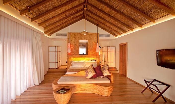 房間面積相當(dāng)大,帶私人泳池,島上的沙灘一級棒,該島另一大特色就是水上別墅的水滑梯是其一大特殊體驗,別墅臥室設(shè)計...