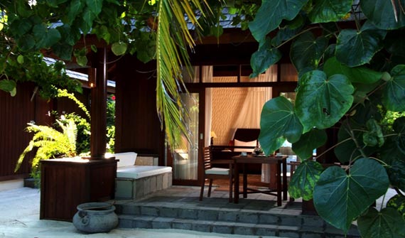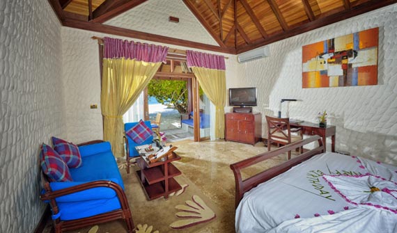 一棟客房有上下兩層共4個套房,都是面海而建,有露天陽臺。陽臺離海很近,站在陽臺上就可以俯視珊瑚海灘和瀉湖的美景。房中有起居室和寬敞的衛(wèi)浴室,還包括舒適大床、沙發(fā)和衛(wèi)星電視等。
