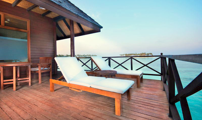 豪華水上別墅位于島嶼向海中延伸區(qū)域,每間房均設有向外延伸的陽臺,陽臺上有休閑躺椅,可進行日光浴。此外,還有一個上浮平臺,該平臺有一專用的樓梯延伸入海中,可由此進行浮潛觀魚。