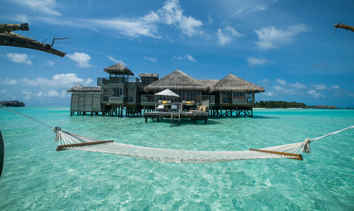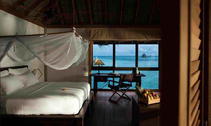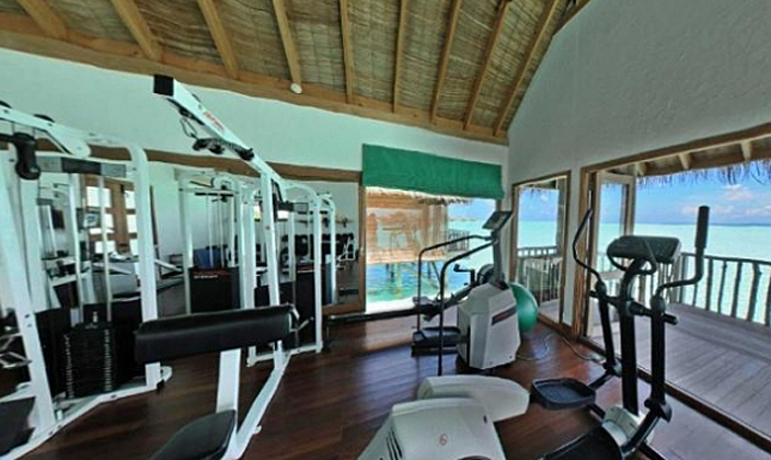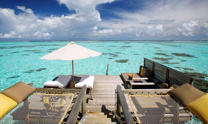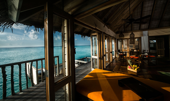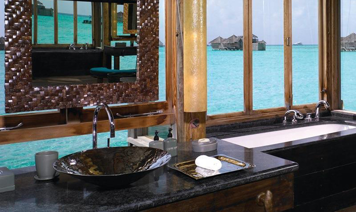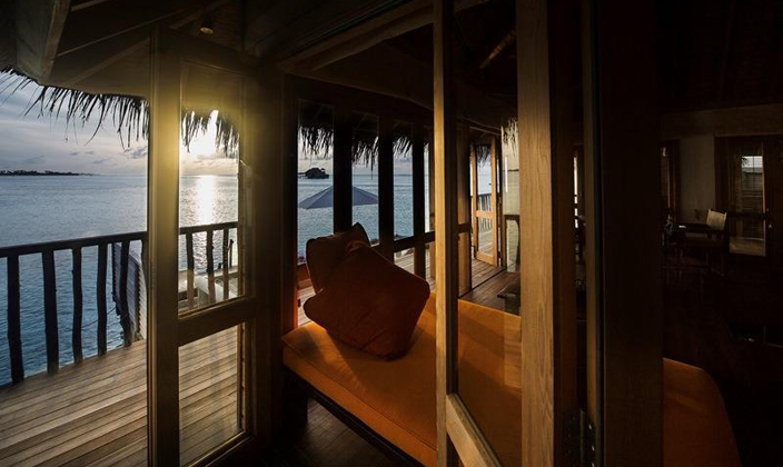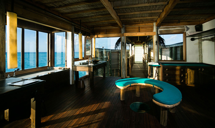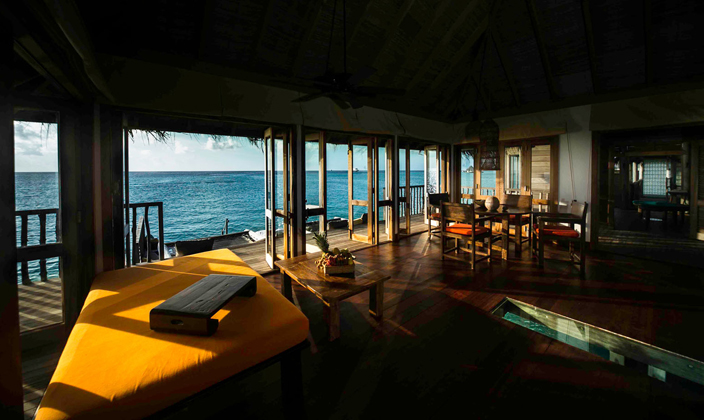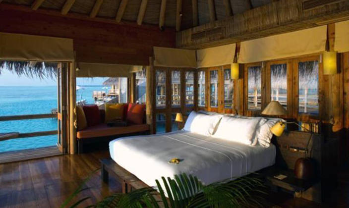全島只有45間水屋,房間面積大,超過(guò)210平方。擁有玻璃地板SPA與360度環(huán)繞海景餐廳,可在客房用餐。