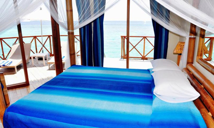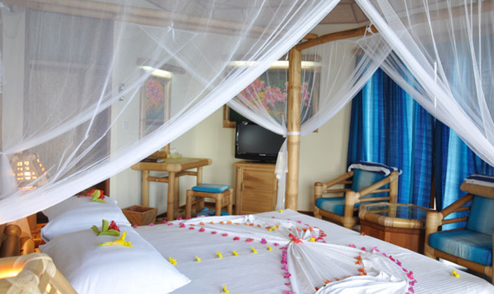 原始海島風(fēng)格,房子呈六邊形,屋頂有厚厚的茅草,房間里的所有家具都是用竹子和藤木做的,非常自然,電器及設(shè)施比較簡(jiǎn)單。豪華房前有陽(yáng)光躺椅,給忘卻時(shí)間的你一個(gè)休憩的場(chǎng)所。