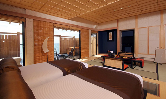 水上日式別墅以傳統(tǒng)日本建筑為設(shè)計(jì)理念,以追求奢華、隱秘住所的賓客需求為標(biāo)準(zhǔn)精心構(gòu)建而成。室內(nèi)裝潢的色調(diào)能夠舒緩情緒,美觀宜人,家具的位置經(jīng)過(guò)精心擺設(shè),散發(fā)出原汁原味的日本情調(diào)?;胍患珴甚r艷的和服,想像自己穿越到了古代日本居住沖繩海岸的傳統(tǒng)民家。擁有寬敞走廊的日式別墅棲于瓦度島綠松石般的水域上。