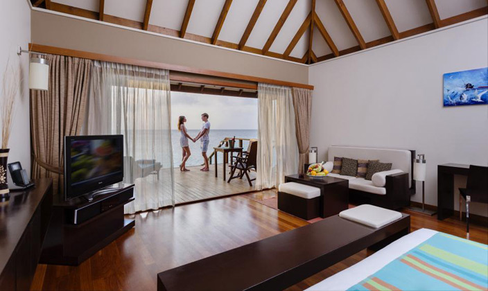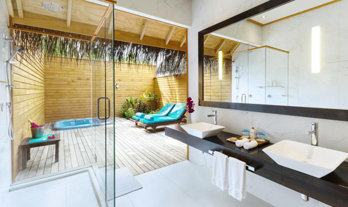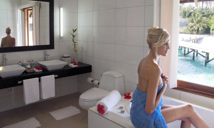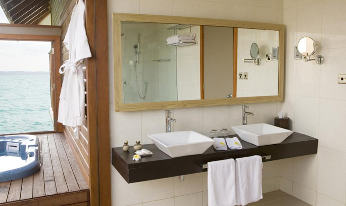 坐落在維利甘度島沙灘對面的瀉湖之上,在這里你可以直接感受到大海的無窮魅力。有個(gè)半露天的靠窗浴缸,露臺(tái)上有直接下海的樓梯(這個(gè)就是water villa露天的浴缸,和Jecuzzi的區(qū)別.)。房內(nèi)設(shè)施齊全,裝潢得體,給人一種無窮的舒適感。