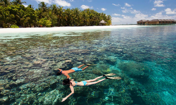 馬爾代夫維拉蔓豪島度假村(VilamendhooMaldives)東西長,南北窄,整體成柳葉型,漫步環(huán)島一周大約半小時。島上有花園房、沙屋、水屋?;▓@房位于島嶼中部,大概有十八間左右,不臨海,所以價格最便宜。沙屋圍繞著島的四周,有接近140座小別墅。島四周都適合浮潛,但是初學(xué)者在島的西南比較合適,這里離海溝最近,不出幾米就能夠觀賞到海溝的盛況,在海溝交界附近魚群密集;如果想看珊瑚,可以選擇在島的東南部浮潛。這里有一片面積超大的死珊瑚,但是距離海面很近,不注意就容易被珊瑚劃傷,在靠近碼頭的地方,是觀賞活珊瑚的最佳地,看著那些活躍的觸角在海里蔓延,很是可愛。