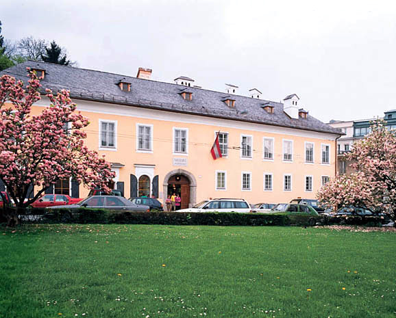 薩爾茨堡市糧食大街9號。這是一座金黃色的6層樓建筑。公元1756年1月27日莫扎特就誕生在這里,并在此度過了他的童年。莫扎特 14歲被任命為宮廷樂師。1781年,他向?qū)m廷提出辭呈,遷居