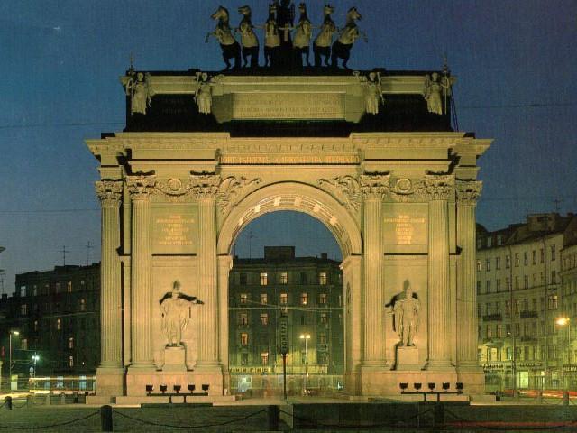 法國巴黎的凱旋門不相上下。因為是紀念同一場戰(zhàn)爭而修建的,是為紀念俄軍打敗拿破侖而建。門高28米,門頂是一尊手執(zhí)月桂花環(huán),背生雙翅驅駕六套馬車的勝利女神像。其下武士,手執(zhí)利劍,或月桂花環(huán)和橄欖枝,象征勝利和平。門柱之間,四尊俄軍士兵,身披盔甲,手執(zhí)盾槍,手指上刻著“驅逐法蘭西,解放