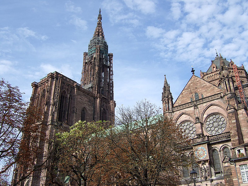 這是一座紅色的大教堂,據(jù)說是用從附近的孚日山脈采取的紅色砂巖石建成的。它是12—15世紀(jì)修建的哥特式教堂,便不由得使人聯(lián)想到以前所見過的,正面有兩座對稱尖塔的各地的大教堂。