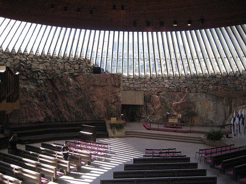 巖石教堂卓越的設(shè)計極為新穎巧妙,完成于1969年,是斯歐馬拉聶兄弟的精新杰作。 教堂是利用位于住宅 巖石教堂街的巖石高地建造而成,為了不損及自然景觀,將巖石部份往下挖掘,教堂就建造在天然巖石中。