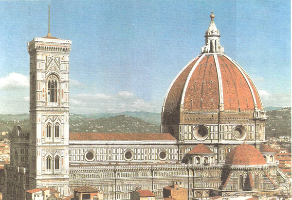 如果說(shuō),圣彼得建造過(guò)程中的麻煩,首先是信仰交鋒,以及伴隨著一連串傳奇般的人事糾葛的話,那么花之圣母教堂所遇到的難題則更多地存在于單純的技術(shù)方面,因?yàn)檫@個(gè)穹窿的建成比前者不僅要早出一百多年,跨度也略有過(guò)之,盡管建筑的總體高度稍有不敵。