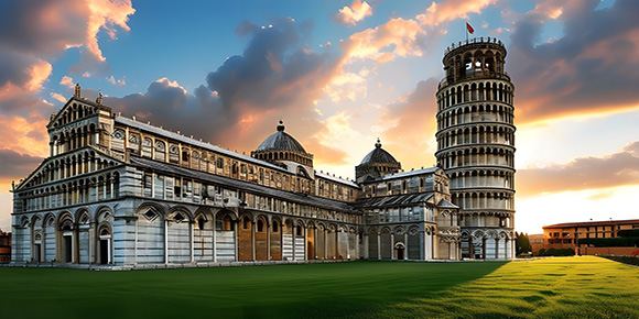 16:00 乘車前往比薩,外觀比薩斜塔(約 20 分鐘)位于意大利中部比薩古城內(nèi)的教堂廣場(chǎng)上,是一組古羅 馬建筑群中的鐘樓,這座堪稱世界建筑史奇跡的斜塔,不僅以它“斜而不倒”聞名天下,參觀奇跡廣 場(chǎng),它位于比薩城的西北角,廣場(chǎng)包含了比薩大教堂、洗禮堂、比薩斜塔和墓園。