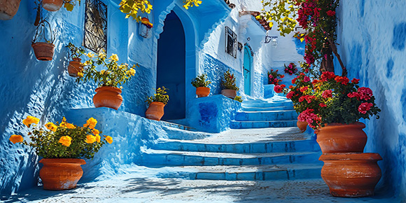 ? 藍(lán)色小鎮(zhèn)—舍夫沙萬:以其古老的傳統(tǒng)藍(lán)色建筑風(fēng)貌而聞名于世。舍夫沙萬建在山坡上,周圍山谷連綿起伏,藍(lán)色的小鎮(zhèn)就像一顆藍(lán)寶石一樣鑲嵌在這里,異常的光彩奪目,曾有一種說法,說是全球有三大著名的藍(lán)城,它們是希臘的圣托里尼、摩洛哥的舍夫沙萬和印度的焦特普爾。