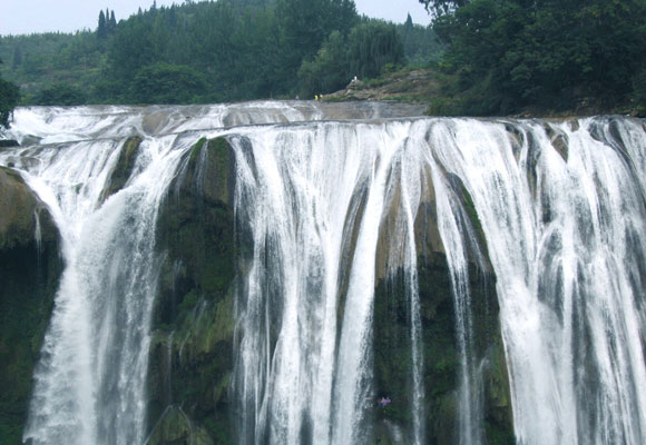 黃果樹瀑布。瀑布離貴陽(yáng)百余公里,行車兩小時(shí)左右便可到達(dá)。高速公路在崎嶇山嶺盤延,一路上我們的兩位區(qū)域經(jīng)理黃經(jīng)理和吳經(jīng)理不時(shí)的給我介紹當(dāng)?shù)氐牡匦蔚孛埠惋L(fēng)土人情。貴州屬喀斯特地形,千姿百態(tài)的峰巒陡然拔地而出,錯(cuò)落有致。孤立者把路邊的水田割成一幅一幅曲線曼妙的鏡面,成群者便相連成嶺,為這青綠的山水畫卷勾勒出濃淡相宜的背景。而那條孕育了中國(guó)第一大瀑布的白水河,便穿行其間。