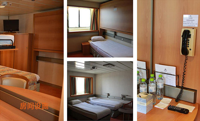 海娜號(hào)郵輪房間較為寬敞,配置齊全,所有房間包含洗漱用品、電吹風(fēng)、保險(xiǎn)箱、電視、電話,每天每人1瓶礦泉水。