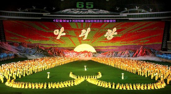 阿里郎是全世界規(guī)模最大的藝術(shù)表演,有約10萬(wàn)人參與表演,向朝鮮領(lǐng)導(dǎo)人金正日及其父親金日成致敬。