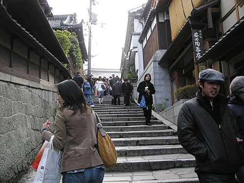 產(chǎn)寧坂石階共有46級,兩旁房舍多半是江戶時期的町屋木造房子,沿途商家多半販賣清水燒、京都特產(chǎn)古風(fēng)瓷品店以及古意盎然的飲食店和紀(jì)念品店。此外,這里還因石階陡峭有“若在此處跌倒,三年內(nèi)會死去”的咒言,又傳說若有賣葫蘆的店,就可破除魔咒,一直到現(xiàn)在,產(chǎn)寧坂山腳下還有一家賣葫蘆的“瓢簞屋、大井人形店”。
