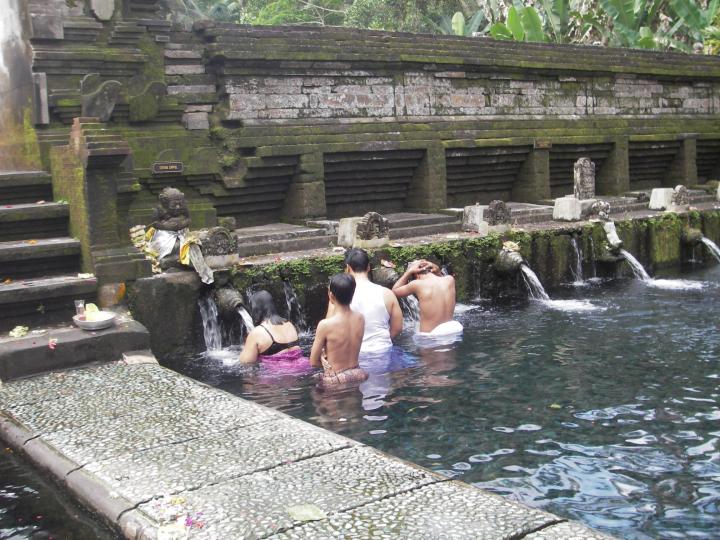 圣泉寺寺幾乎是每個(gè)觀光客必到之處,其歷史最早可追溯到西元962 年,據(jù)說(shuō),這里的圣泉永遠(yuǎn)都是清澈,還具療效,而且不同出口的圣水療效不同,吸引來(lái)自各地的善男信女前來(lái)頂禮膜拜、沐浴。圣泉涌出地面的情景很是動(dòng)人,石壘水池池底遍布黑色細(xì)沙,泉眼處,水涌沙舞,如碩大的黑牡丹,盛開(kāi)在倒映著藍(lán)天綠樹(shù)的清水中,傳說(shuō)這是大神因陀羅(INDRA)以劍插地引出的不老不死水,洗滌百病。水流出泉眼池,經(jīng)由一排二十四個(gè)龍首,流入下面的大水池,這里是朝圣人的接水口和沐浴地。對(duì)應(yīng)著每個(gè)龍首,水下都有一個(gè)石樁供人站立,否則便會(huì)沒(méi)頂。