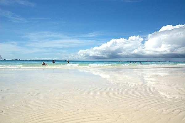 白沙灘是長灘島得以聞名世界的最大原因。它位于島的西岸中段,從南到北延伸,長達(dá)4公里,是由大片珊瑚磨碎后形成的,沙灘平緩舒展,沙質(zhì)潔白細(xì)膩,即使在驕陽似火的正午時分,踏在沙上也依然清涼。到了晚上,