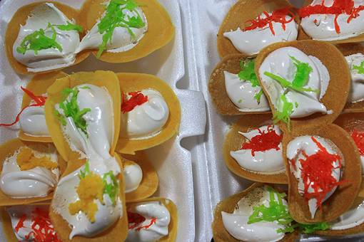 還有一種好吃的街頭甜食稱為“烤椰塔(Khanom Krok)”,這種甜食是將濃稠的椰粉、米的粉末、雞蛋和糖混合,然后放在塑模的陶鍋里煮。在泰國(guó)許多街上的攤販都有賣。另一特色是用水浸花 (如茉莉花或玫瑰花瓣), 用含花香的水來(lái)做糖漿。最簡(jiǎn)單的“冰浮”,就是利用各橙類水果本身有甜酸的味道, 切成碎片, 再加上糖漿和冰塊, 浮一兩片玫瑰或茉莉花瓣。在炎炎夏天里, 這無(wú)疑是最佳的清涼的甜飲品;熟而甜蜜的菠蘿汁也可以用來(lái)作甜品。